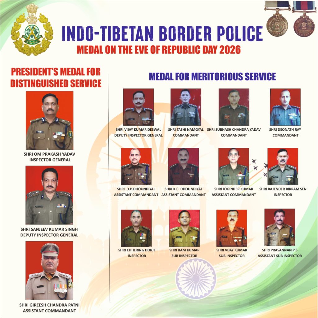25 January 2026, New Delhi: A total of 15 ITBP officials have been announced to receive Medals on the occasion of the 77th Republic Day, 2026. Among them, 3 officials will be conferred with the President’s Medal for Distinguished Service, while 12 officials will be honored with the Medal for Meritorious Service.