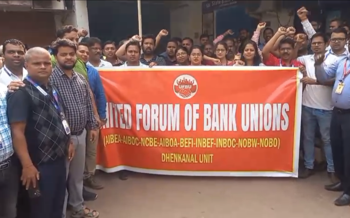 ଢେଙ୍କାନାଳ – ଆଜି ୫-ଦିନିଆ ବ୍ୟାଙ୍କିଂ ବ୍ୟବସ୍ଥା ଦାବିକୁ ନେଇ SBI ମେନ୍ ବ୍ରାଞ୍ଚ ସମ୍ମୁଖରେ ସମସ୍ତ ବ୍ୟାଙ୍କ କର୍ମଚାରୀମାନେ ଏକତ୍ରିତ ହୋଇ ଧର୍ମଘଟ କାର୍ଯ୍ୟକ୍ରମ ଆୟୋଜନ କରିଥିଲେ।