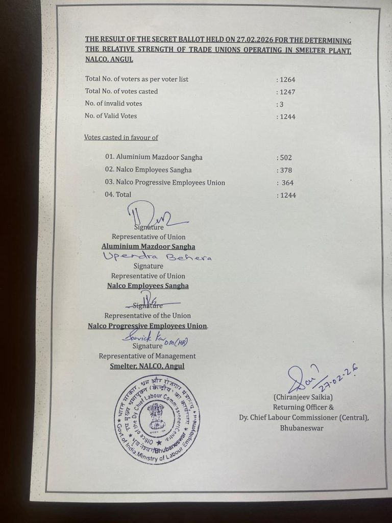ଅନୁଗୋଳ – ଅନୁଗୋଳ ଜିଲ୍ଲାରେ ଗଢି ଉଠିଥିବା ସର୍ବ ପୁରାତନ ଓ ନବରତ୍ନ ଉଦ୍ୟୋଗ ନେସନାଲ ଆଲୁମିନିଅମ କମ୍ପାନୀ ନାଲକୋ ସ୍ମେଲ୍ଟର୍ ପ୍ଲାଣ୍ଟ ଠାରେ ୩୭/୦୨/୨୦୨୬ ତାରିଖରେ ଅନୁଷ୍ଠିତ ୟୁନିଅନ୍ ମ୍ୟନ୍ୟତା ପ୍ରାପ୍ତ (recognize) ନିର୍ବାଚନରେ ଏ ଏମ ଏସ ବା ଆଲୁମିନିଅମ ମଜଦୂର୍ ସଂଘ ବିପୁଳ ବିଜୟ ହାସଲ କରିଛି। ଏହି ନିର୍ବାଚନରେ ତିନି ପ୍ରମୁଖ ୟୁନିଅନ, ଏନ୍ ଇ ଏସ, ଏନ୍ ପି ଇ ୟୁ ଓ ଏ ଏମ ଏସ ପ୍ରତିଦ୍ବନ୍ଦୀତା କରିଥିଲେ। ସଭାପତି ମୁନା ସାମଲଙ୍କ ନେତୃତ୍ୱରେ ଭାରତୀୟ ମଜଦୂର ସଂଘ ସହବନ୍ଧିତ ଏ ଏମ୍ ଏସ ଏହି ବିଜୟ ହାସଲ କରିଥିବାରୁ ଅନୁଗୋଳ ବିଧାୟକ ଶ୍ରୀ ପ୍ରତାପ ଚନ୍ଦ୍ର ପ୍ରଧାନ, ଢେଙ୍କାନାଳ ଏମ ପି ରୁଦ୍ର ନାରାୟଣ ପାଣି, ପାଲଲହଡା ବିଧାୟକ ଶ୍ରୀ ଆଶୋକ ମହାନ୍ତି ପ୍ରମୁଖ ଶୁଭେଚ୍ଛା ଜଣାଇଥିଲେ। ସମୁଦାୟ ୧୨୬୪ ଟି ଭୋଟ ରହିଥିବା ବେଳେ ୧୨୪୭ ଗୋଟି ଭୋଟ ଗ୍ରହଣ ହୋଇଥିଲା। ଏଥି ମଧ୍ୟରୁ ତିନିଗୋଟି ଭୋଟ ନାକଚ ହୋଇଥିବା ବେଳେ ୧୨୪୪ଟି ଭୋଟ ବୈଧ ଘୋଷଣା ହୋଇଥିଲା।